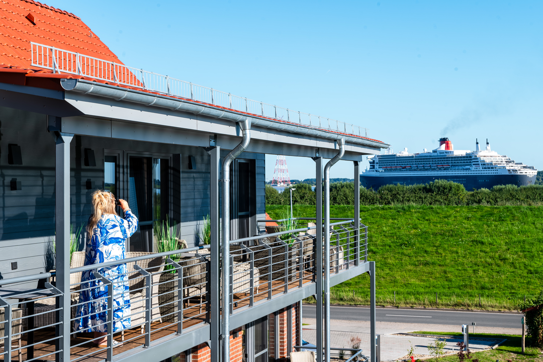 Abends kehrt Ruhe ein. Auf den Balkonen sitzen Gäste mit Blick ins Grüne oder Richtung Elbe. Wer möchte, spaziert noch einmal über den Deich, sieht die untergehende Sonne hinter den Containerschiffen und ist in wenigen Minuten wieder zurück in seiner Wohnung. Oft trifft man sich noch im Hof der Anlage, kommt ins Gespräch und tauscht Tipps aus – eine kleine Gemeinschaft, die für die Zeit des Aufenthalts zum Urlaub dazugehört.